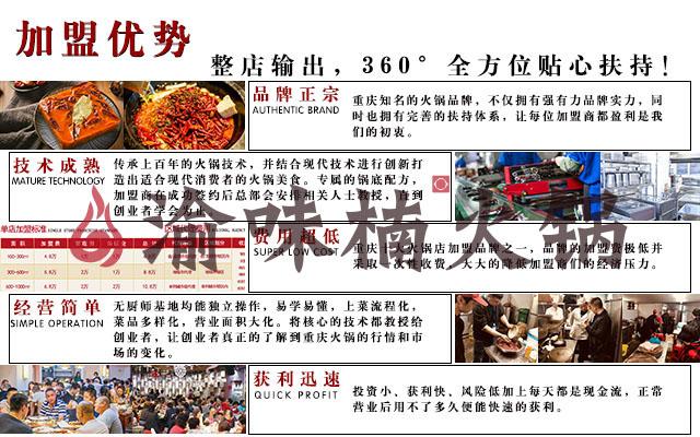作为重庆十大火锅排名中的品牌,渝味楠老火锅有实力,有魄力,有魅力,对创业创业者更有突出的优越性,是投资加盟好品牌,合作共赢好同伴!